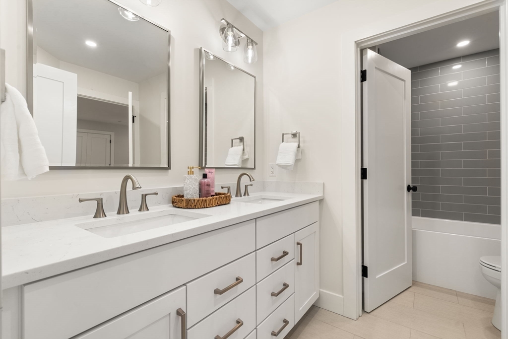 Elegantly crafted NEW CONSTRUCTION designed for today's living, this townhouse-style home offers 3 bedrooms, 3.5 baths, and a 2-car garage w/custom finishes and a flexible open floor plan ideal for everyday living & entertaining. The main level features a high-end kitchen w/quartz counters & backsplash, painted cabinetry & gorgeous cashew-stained island w/beverage center, Thermador SS appliances, gas range, and built-in microwave. The kitchen opens to a sun-filled family room with gas fireplace, quartz surround, custom mantel, detailed wall molding, high ceilings, recessed lighting & hardwood floors throughout. The primary suite includes a spa-like bath with soaking tub, separate vanities, makeup vanity with lighted mirror, and custom closet. The finished LL offers two finished rooms, a full bath & vinyl plank flooring. Laundry room w/cabinetry w/quartz counters. Black matte hardware throughout, abundant natural light, rare large backyard, easy highway access complete this a MUST SEE!